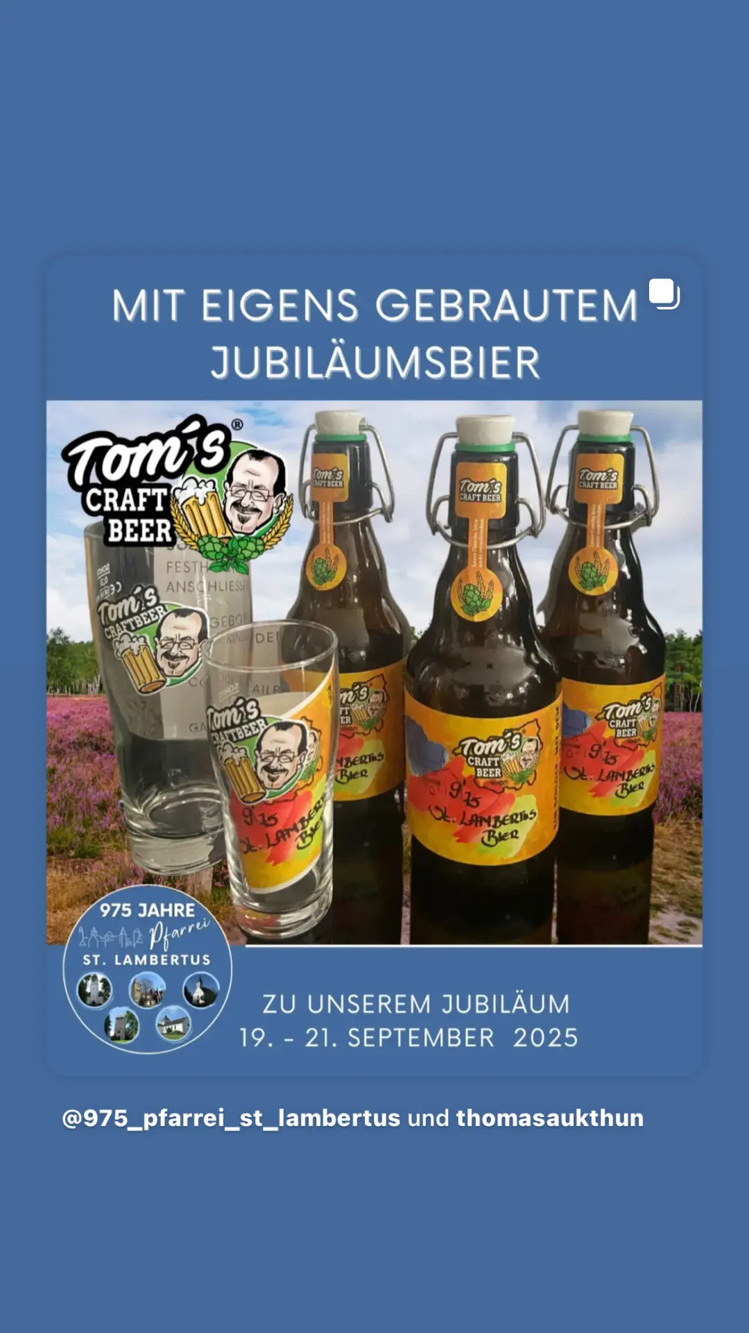 Zur Feier der 975 Jahre St. Lambertus Kirche in Ense gebraut, ist dieses unfiltrierte Bier eine Hommage an unsere Tradition. Kräftige Aromahopfen wie Mandarina Bavaria und Citra treffen auf eine sanfte Karamellnote. Mit 14° Plato Stammwürze und 5,5 % Alkohol ein hopfenaromatisches, durstlöschendes Geschmackserlebnis – speziell für diesen besonderen Anlass.